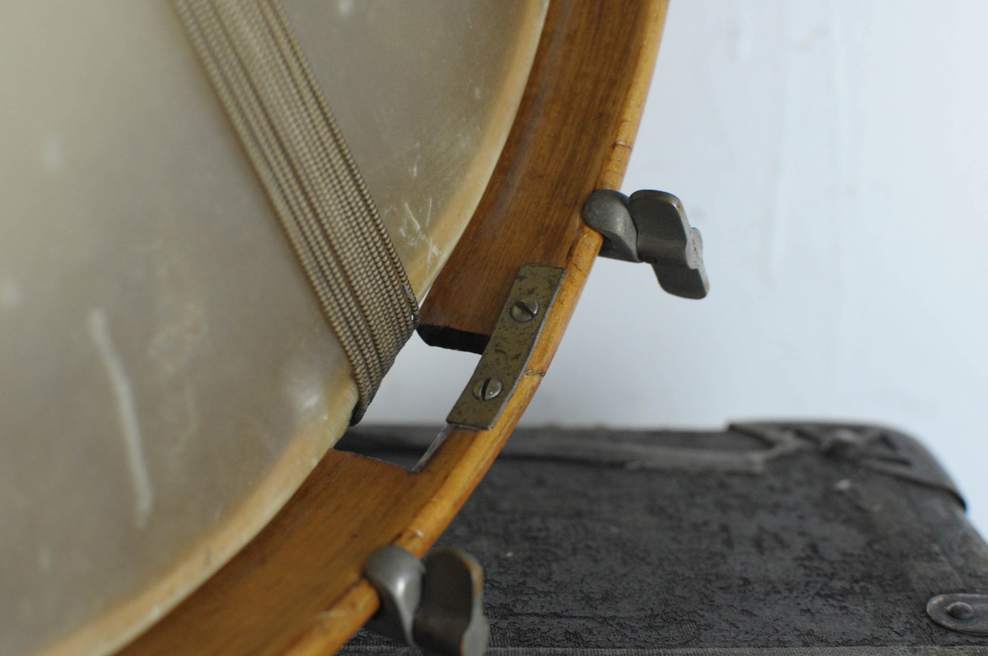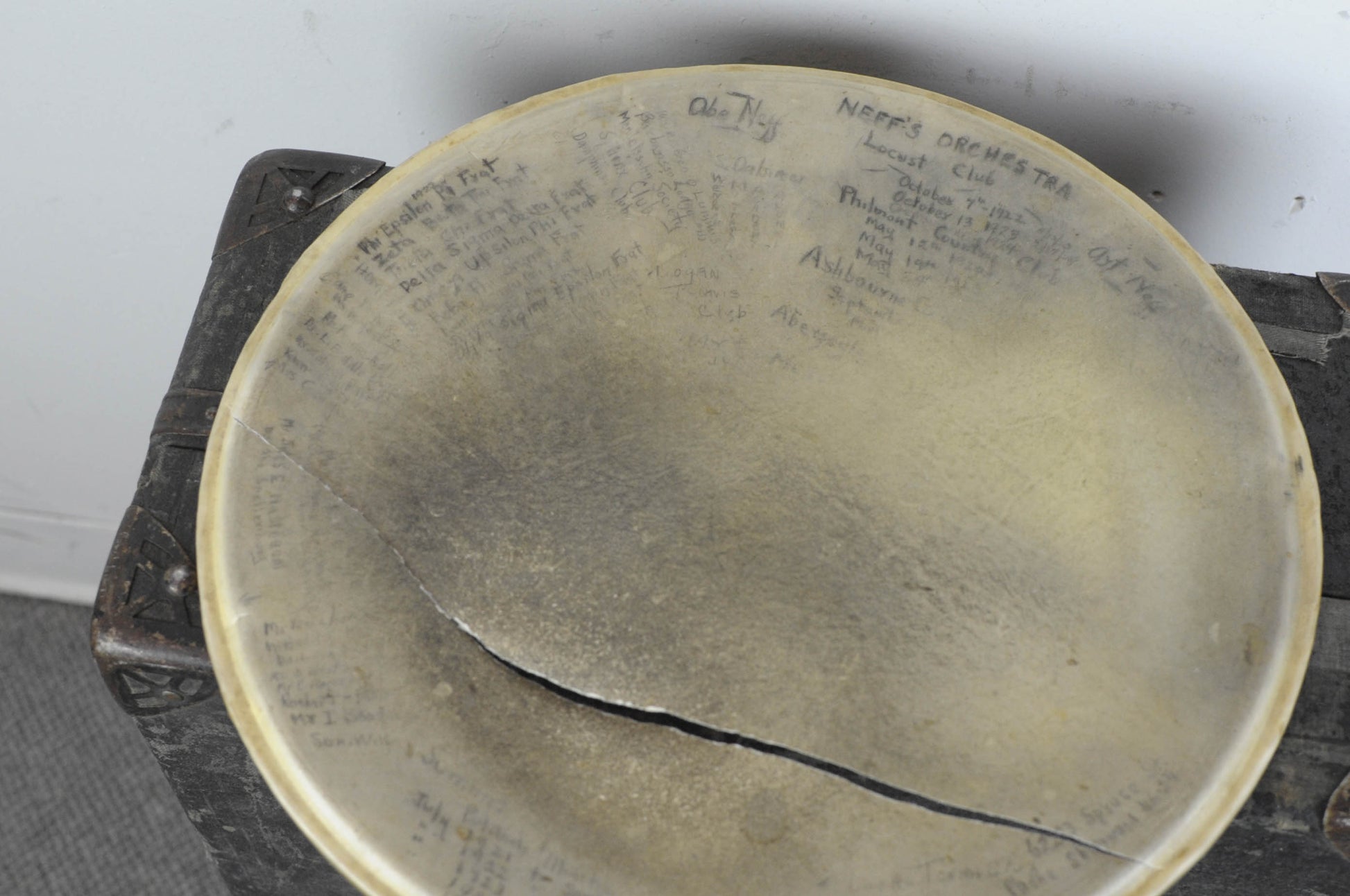 - This drum comes with provenance as it was used by the famous Neff Orchestra in the 1920s. In the last picture you can see the original calf skin head with the locations the drum was used. The head will be included with the sale of the drum